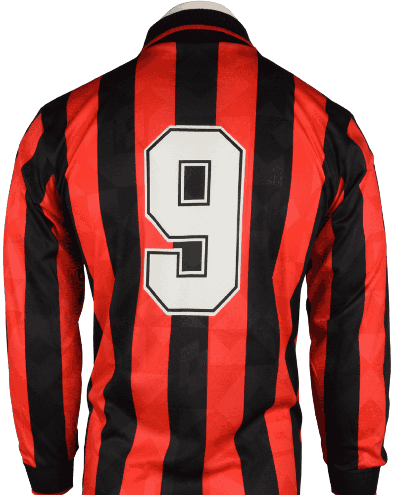 Achterop het shirt rugnummer 9 van Marco van Basten. De topspits speelde 205 wedstrijden voor Milan waarin hij 129 keer scoorde.