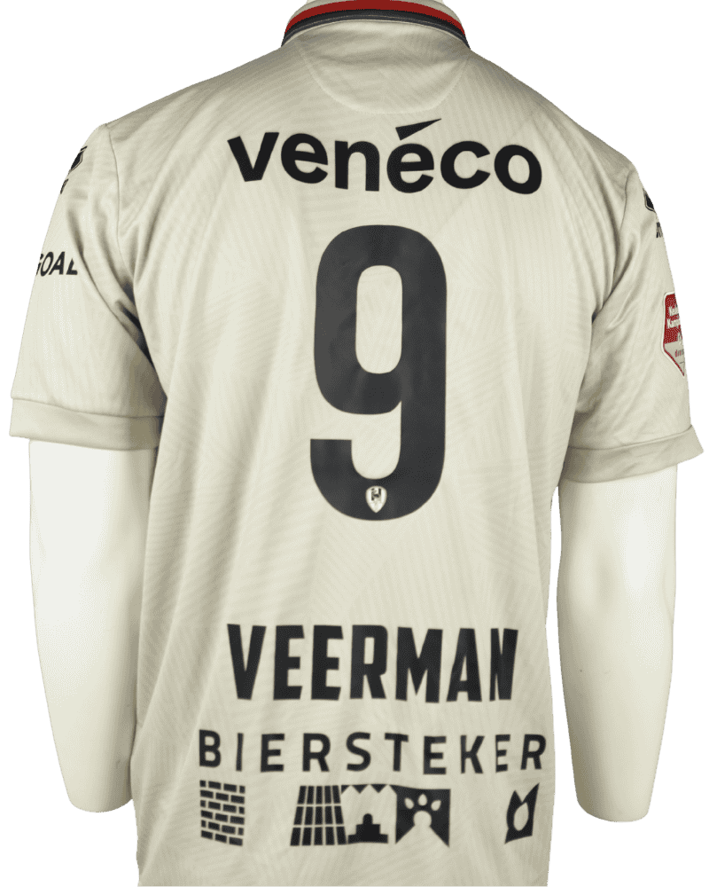 Dit is een matchworn uitshirt van Ado Den Haag, uit het seizoen 23/24. Achterop het shirt de naam en het rugnummer van de Nederlandse, spits Henk Veerman.