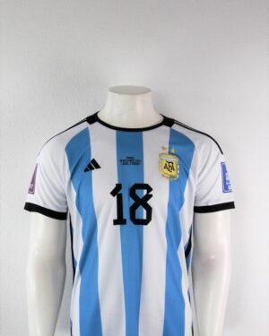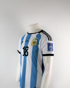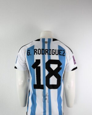 Dit is een gesigneerd thuisshirt van Argentinië. WK voetbal 2022 in Qatar. Achterop het shirt de naam en het rugnr van de verdedigende middenvelder Guido Rodríguez.