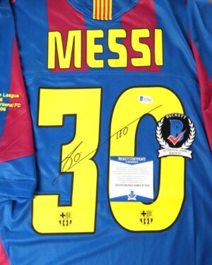 Dit is een gesigneerd thuisshirt van FC Barcelona. Champions League finale. 17-05-2006. Saint-Denis. Achterop het shirt de naam en het rugnr van voetbal grootheid Lionel Messi.