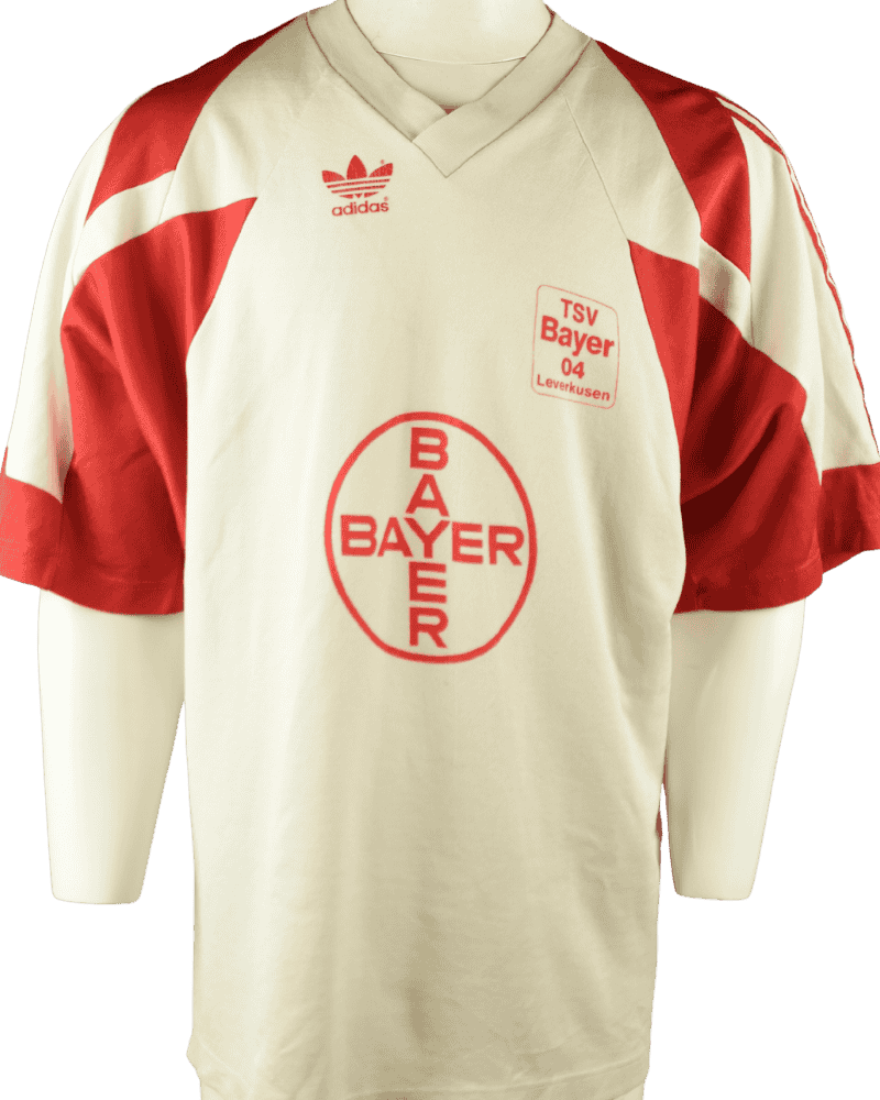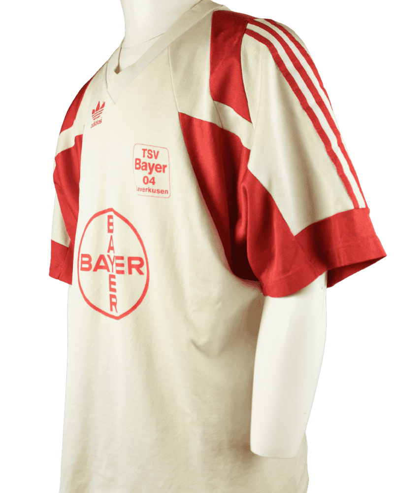 Dit is een vintage uitshirt van Bayer 04 Leverkusen, uit de jaren 80.