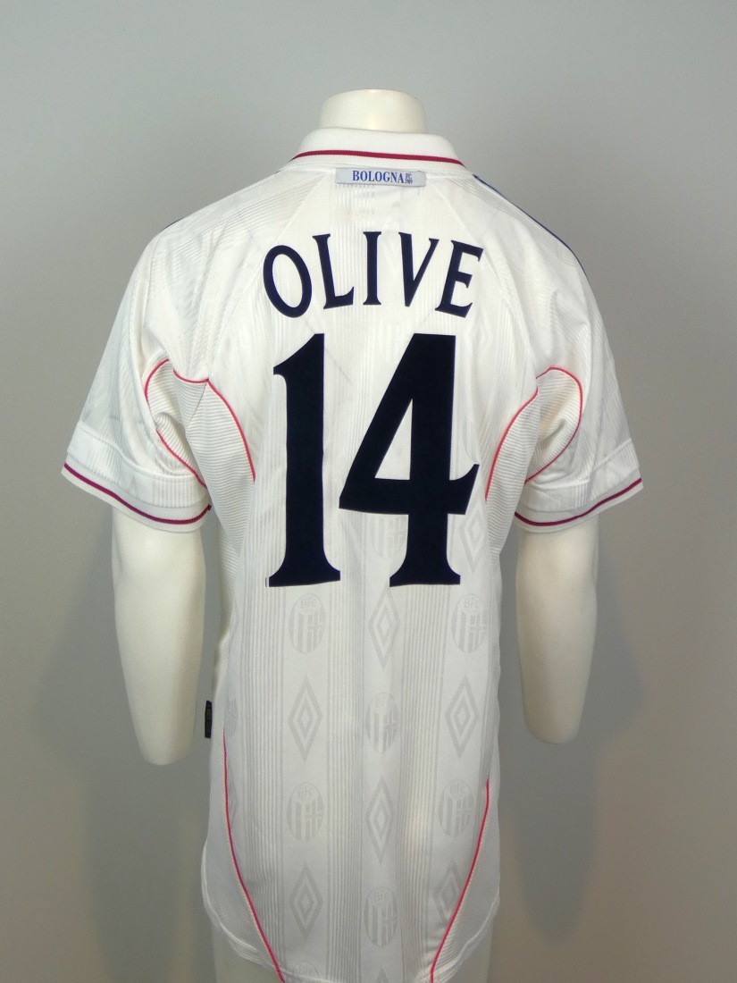 Dit is een vintage matchworn uitshirt van Bologna, uit seizoen 00/01. Achterop het shirt rugnummer en naam van Renato Olive. Een officieel echtheidscertificaat ontbreekt als zo vaak bij dit type shirts. Maar aan alle details zie je dat dit een matchworn (wedstrijd gedragen) shirt is. Meer informatie, vragen of opmerkingen over het item. ‘Laat het me gerust weten via de WhatsApp button (knop) links op jouw beeldscherm.