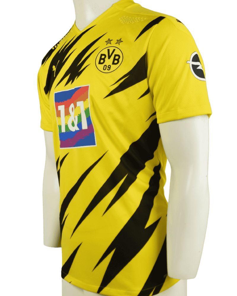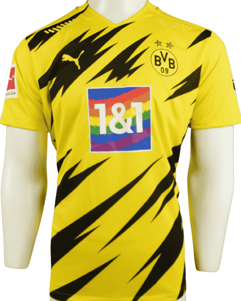 Dit is een match-prepared thuisshirt van Borussia Dortmund. Bayern München 4-2 Borussia Dortmund. (06-03-21) Het is uniek shirt vanwege de speciale regenboog versie van de hoofsponsor, wat staat voor Lgbt.
