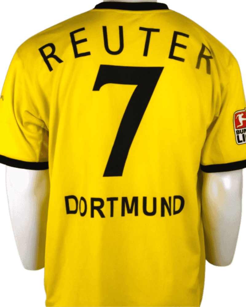 Achterop het shirt naam en rugnummer van Stefan Reuter. De verdediger speelde 381 wedstrijden voor Dortmund waarin hij 15 keer scoorde.