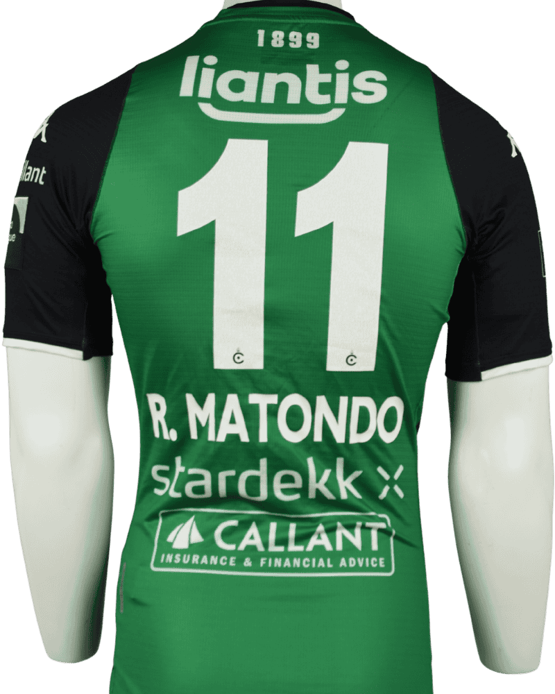 Dit is een matchworn thuisshirt van Cercle Brugge, uit het seizoen 21-22. Achterop het shirt de naam en het rugnummer van de vleugelaanvaller, Rabbi Matondo.