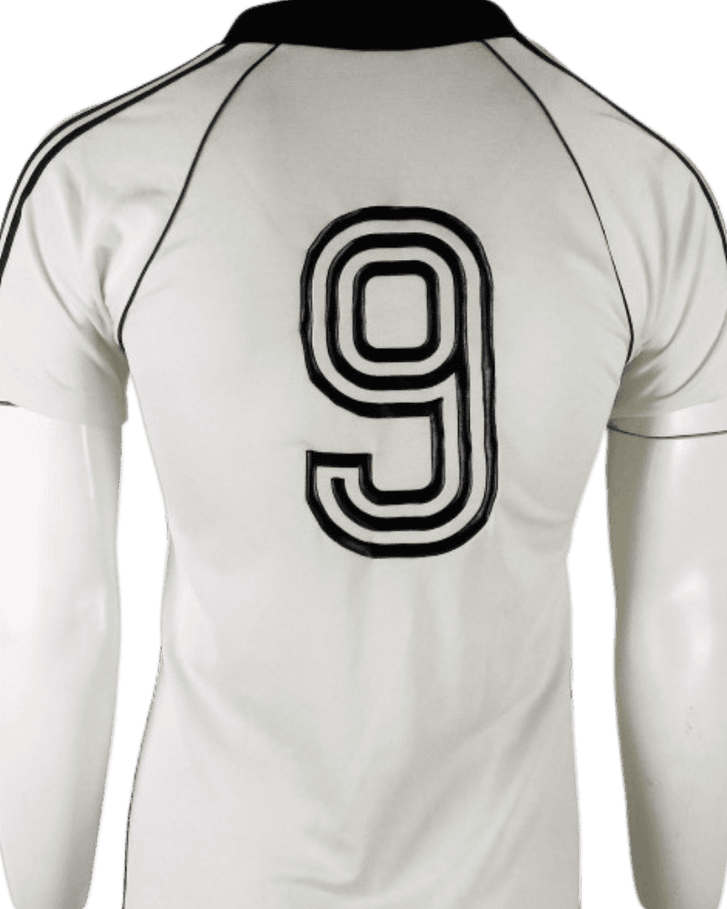 Achterop het shirt het rugnummer 9 van Horst Hrubesch. De kopsterke spits speelde in totaal 21 interlands voor toen nog West Duitsland. Daarin wist hij 6 keer te scoren waaronder in de EK finale 1980 tegen België.