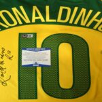 Esta es una camiseta firmada de la selección brasileña de fútbol del periodo 2004-06. En la parte posterior de la camiseta se encuentran el nombre y el número de la leyenda del fútbol Ronaldinho. Junto al número, se encuentra su firma, la cual fue verificada por un representante del proveedor de certificados de autenticidad Beckett. El certificado y el holograma (código QR) ubicados en la parte posterior de la camiseta contienen un número de certificación que se puede verificar en el sitio web correspondiente.La camisa está en perfecto estado. Más información, dudas o comentarios sobre el artículo. 'Por favor, háganmelo saber a través del botón de WhatsApp de la izquierda. tu pantalla. Compra ahora esta camiseta única de este gran futbolista, suelto o en marco. Disponible exclusivamente en Kickandrush.