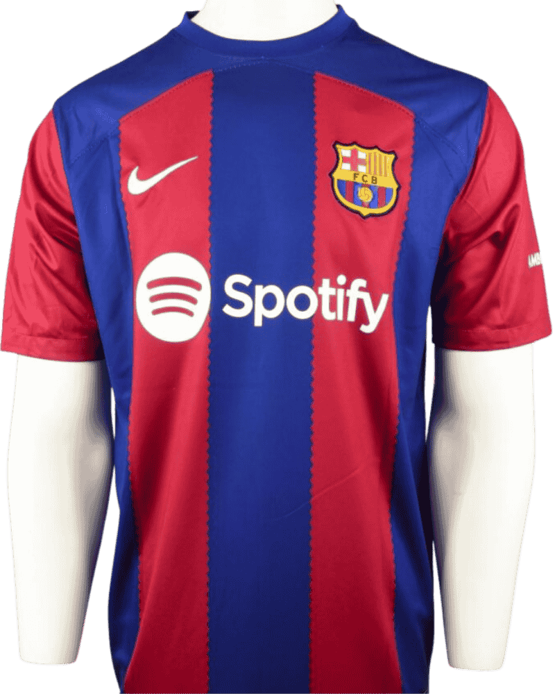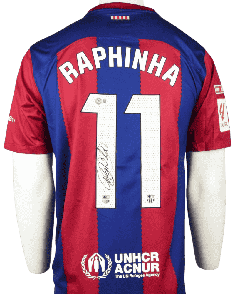 Dit is een gesigneerd thuisshirt van FC Barcelona, uit het seizoen 23-24. Achterop het shirt de naam en het rugnummer van top buitenspeler Raphael Dias Belloli, oftewel Raphinha.