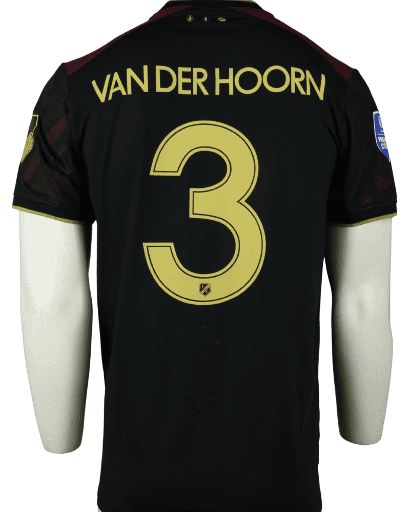Achterop het shirt de naam en het rugnummer van centrale verdediger Mike van der Hoorn.