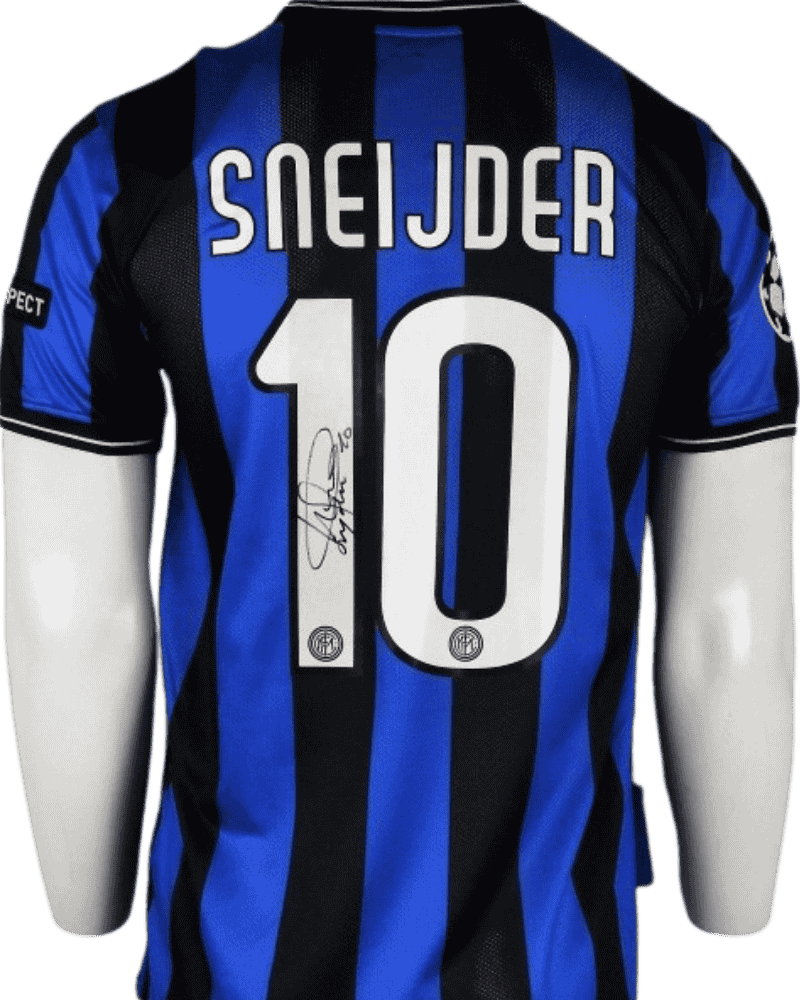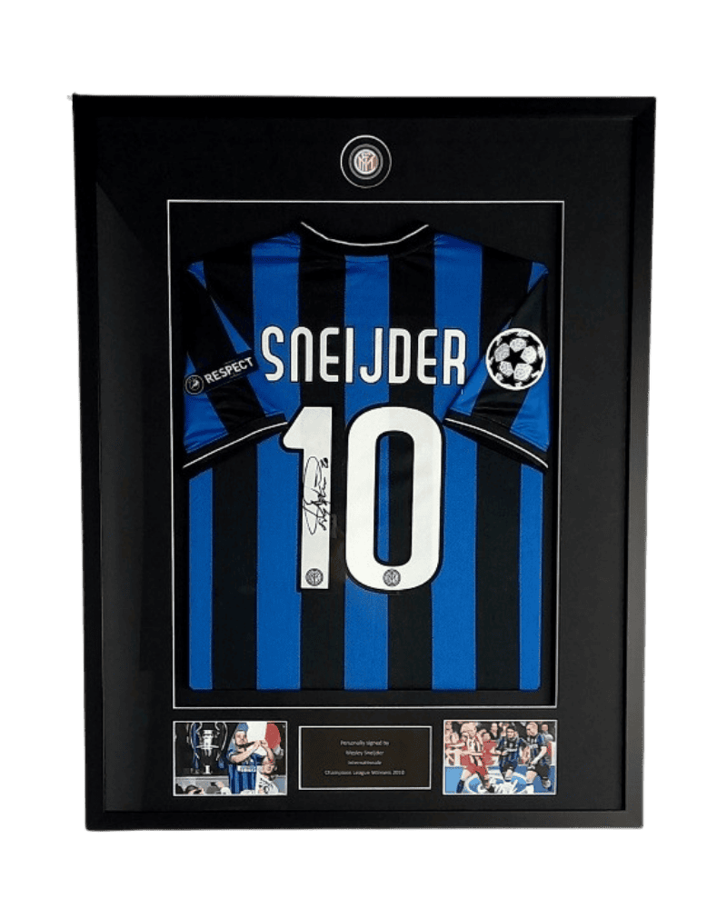 Dit is een gesigneerd ingelijst thuisshirt van Inter Milaan, uit het seizoen 09/10. Achterop het shirt de naam, rugnummer en handtekening van voormalig top middenvelder Wesley Sneijder. Incl. tekenfoto en een video van het moment van signeren.