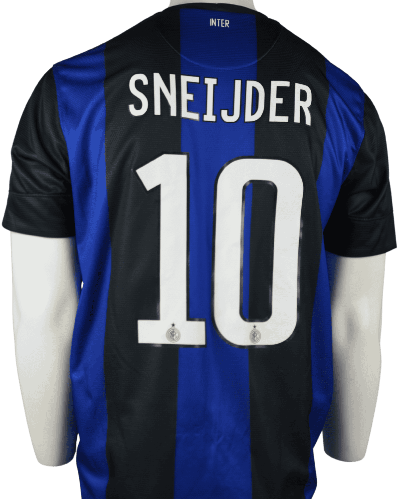 Achterop het shirt naam en rugnummer van Wesley Sneijder. De topmiddenvelder speelde zo 116 wedstrijden voor Inter waarin hij 22 keer scoorde en 35 assists gaf.