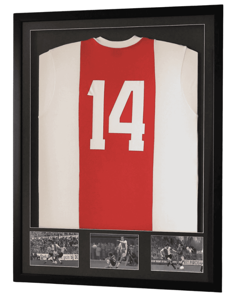 Johan Cruijff (Nr 14) Ingelijst Ajax thuisshirt met 3 foto’s en Naamplaatje