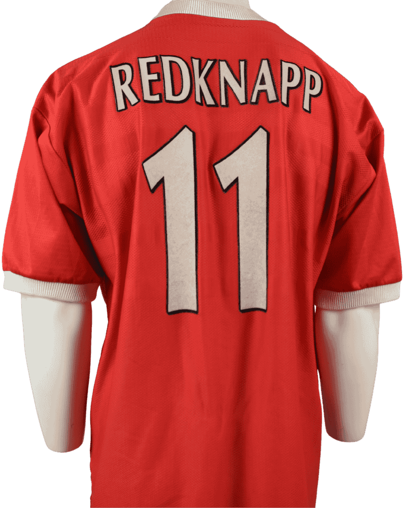 Het shirt is gedragen door Engelse voetballer Jamie Redknapp, het is gedragen in een Europese wedstrijd. (Europacup)