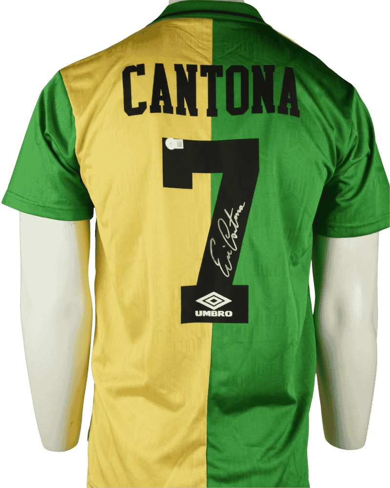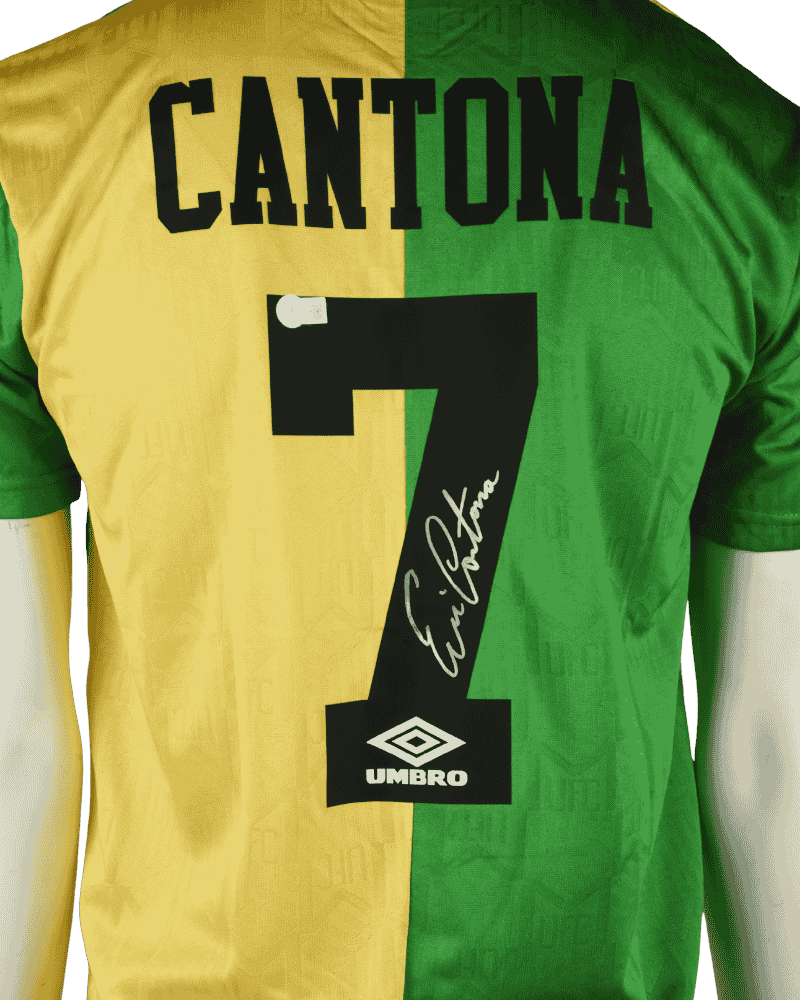 Dit is een gesigneerd derde shirt van Manchester United uit de periode 1992-94. Achterop het shirt de naam, rugnr en handtekening, die Éric Cantona heeft gesigneerd. De handtekening is waargenomen door een vertegenwoordiger van de betrouwbare COA leverancier Beckett.