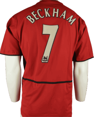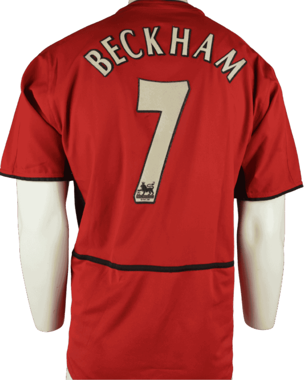 Achterop het shirt naam en rugnummer van David Beckham. De middenvelder speelde 394 wedstrijden voor United waarin hij 85 keer scoorde.
