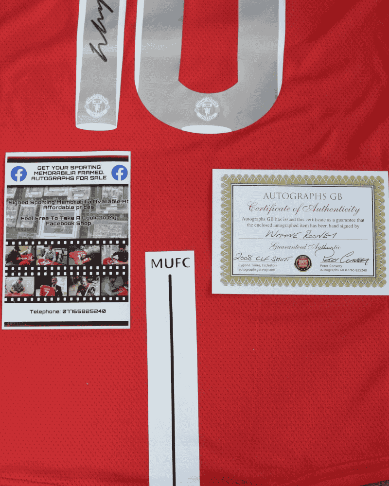 Op het rugnr vind je zijn handtekening die hij gesigneerd heeft op een signeersessie voor de COA (echtheidscertificaat) leverancier Autographs GB wat toebehoort aan de gerespecteerde Peter Convery, die een eigen voetbal memorabilia winkel heeft in Manchester. Samen met de toebehorende tekenfoto is het de garantie dat dit shirt is gesigneerd door Wayne Rooney.