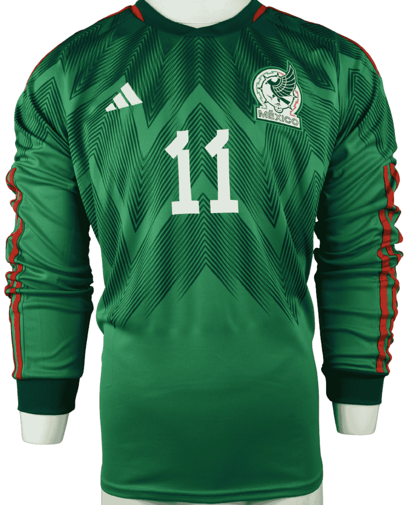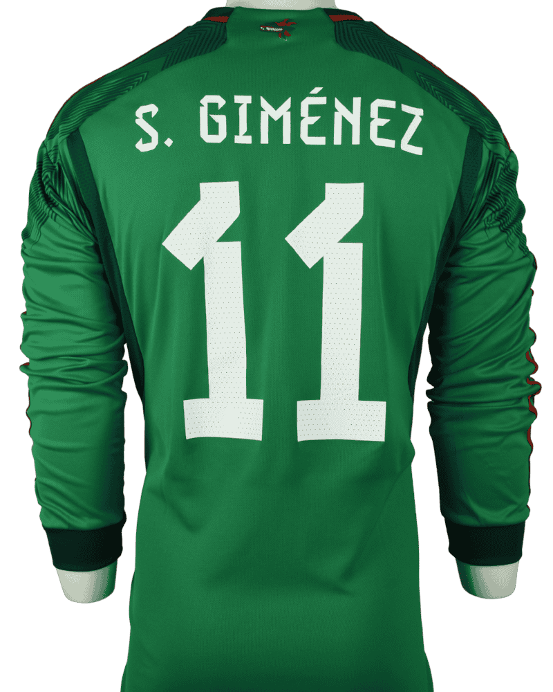 Dit is een thuisshirt van het Mexicaanse, elftal. Achterop het shirt de naam en het rugnummer 11 wat toebehoort aan goaltjesdief en top aanvaller Santiago Giménez.
