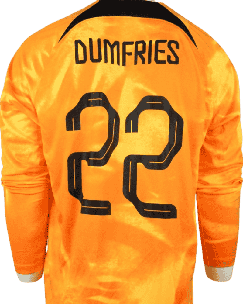 Achterop het shirt naam en rugnummer van Denzel Dumfries.