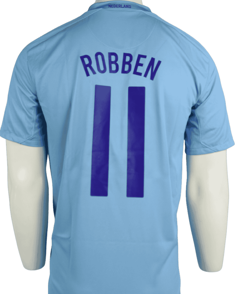 Achterop het shirt naam en rugnummer van oud wereldvoetballer Arjan Robben.