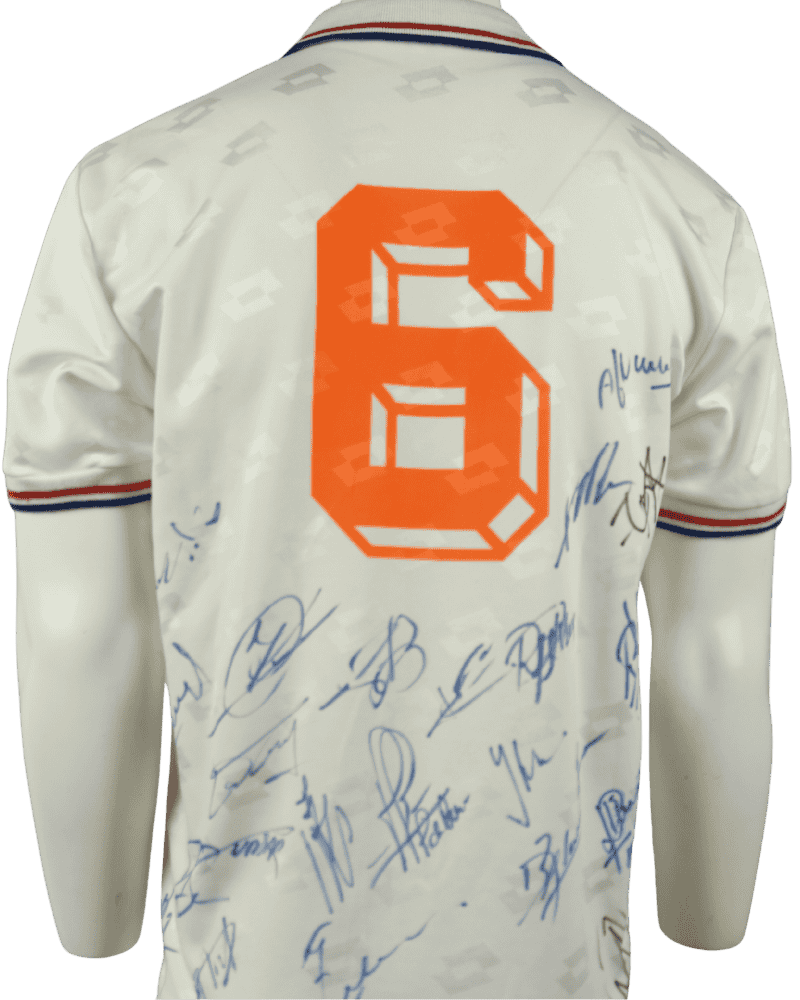 Dit is een gesigneerd matchworn uitshirt van het Nederlands elftal. 07-06-1995. EK Kwalificatie wedstrijd uit tegen Wit-Rusland. Achterop het shirt rugnummer 6 wat toebehoort aan voormalig middenvelder Wim Jonk en verschillende handtekeningen van Oranje spelers (zie foto).