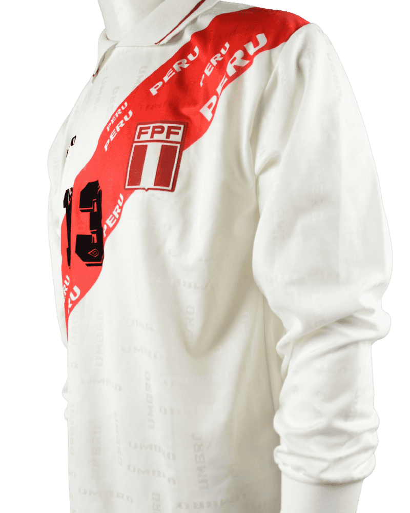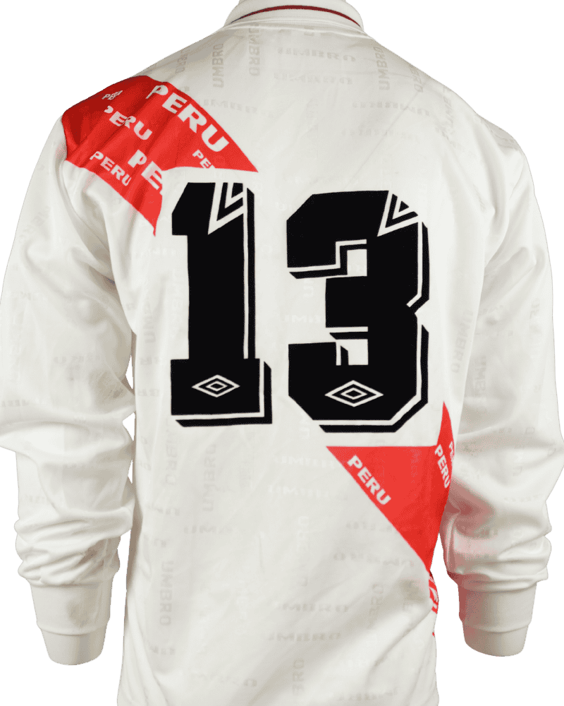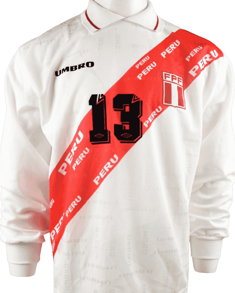 Dit is een thuisshirt van Perú. Nederland VS Perú, op 10-10-1998. Vriendschappelijk interland. Achterop het shirt rugnummer 13 wat toebehoort aan de Peruviaanse verdediger Jorge Huamán.