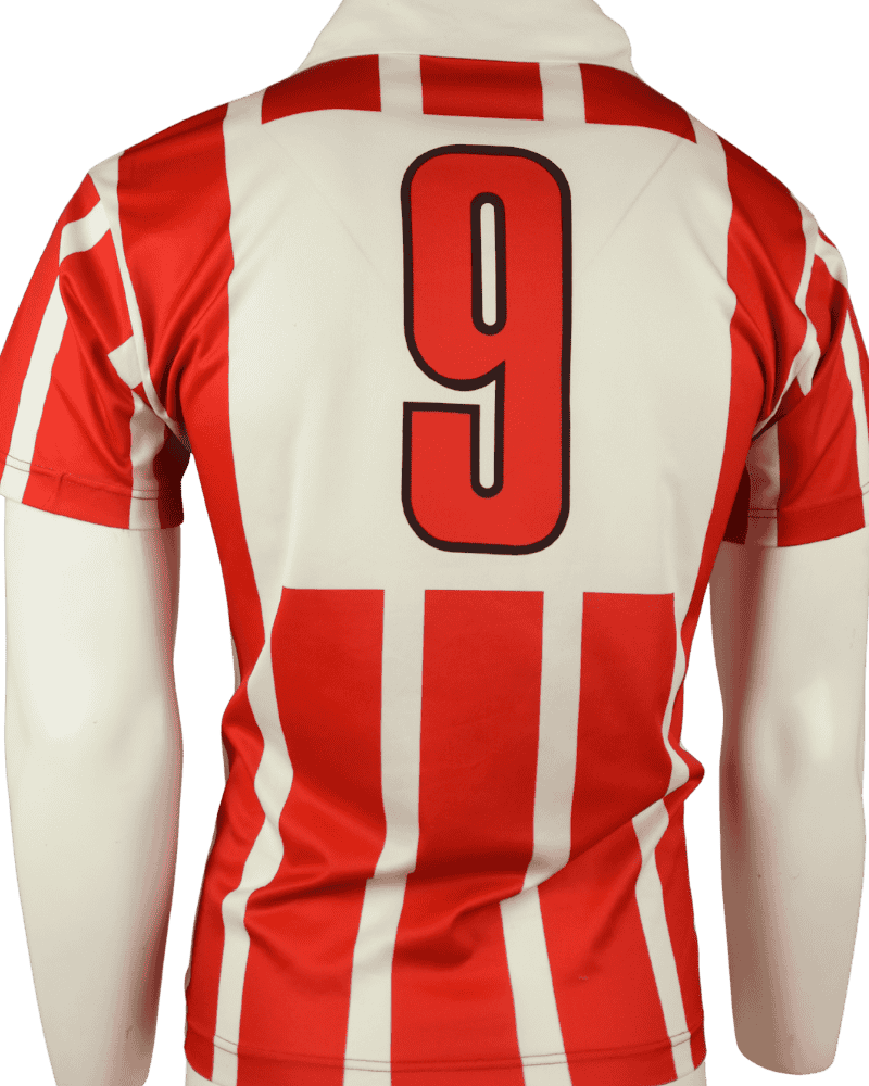 Achterop het shirt rugnummer 9 van Romário de Souza Faria. De Braziliaanse, topspits speelde 149 wedstrijden voor PSV waarin hij 128 keer scoorde.