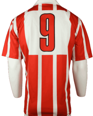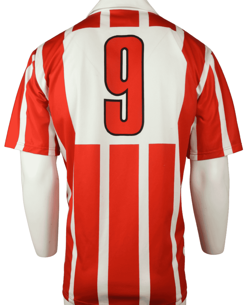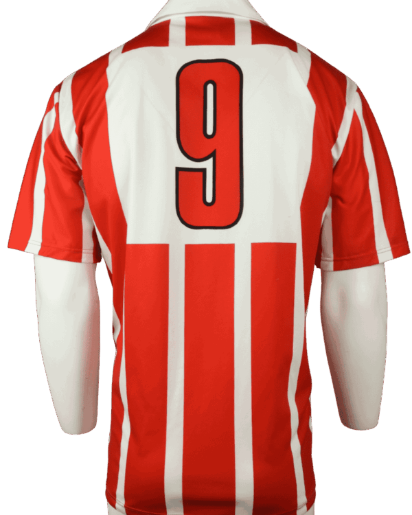 Achterop het shirt rugnummer 9 van Romário de Souza Faria. De Braziliaanse, topspits speelde 149 wedstrijden voor PSV waarin hij 128 keer scoorde.