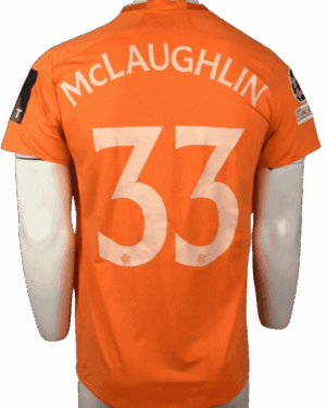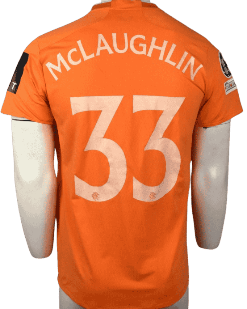 Dit is een wedstrijdgedragen keepershirt van Rangers FC, uit 2022. Achterop het shirt de naam en het rugnummer van keeper Jon McLaughlin. Shirt is gedragen in de CL wedstrijd tegen Ajax die ze met 4-0 verloren.
