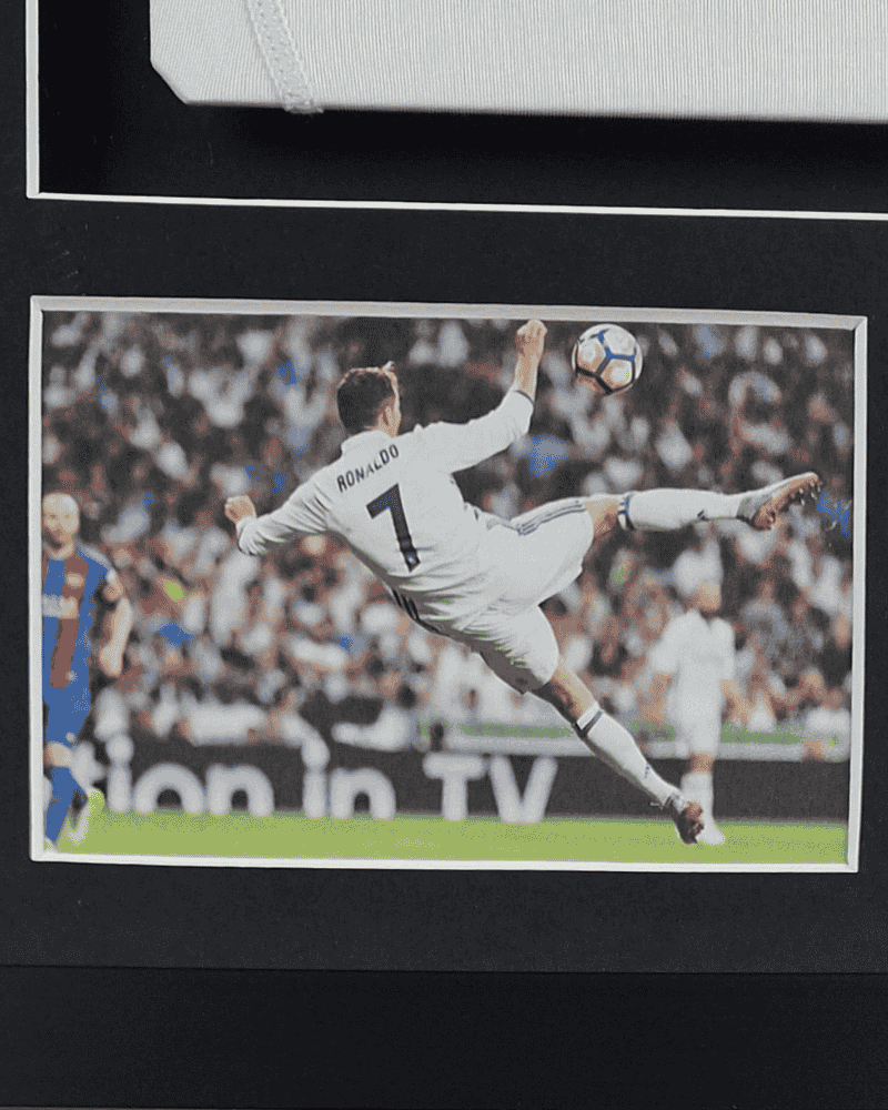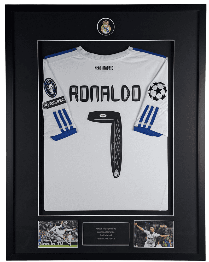 Het exemplaar is op zeer nette wijze ingelijst in een frame van top kwaliteit. Met afmetingen van 93,3 bij 73,3cm. Daarbij komt boven het shirt het logo van Real Madrid. Onder twee prachtige foto’s en in het midden de tekst: Personally signed by Cristiano Ronaldo – Real Madrid – Season 2010-2011. Meer informatie, vragen of opmerkingen over het item. ‘Laat het me weten via de WhatsApp button (knop) links op jou beeldscherm.Â