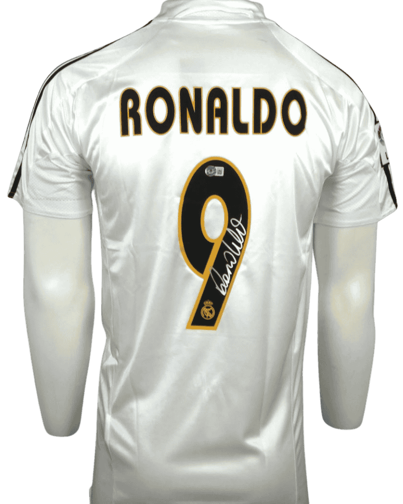 Dit is een gesigneerd thuisshirt van Real Madrid, uit het seizoen 04/05. Achterop het shirt de naam en het rugnummer van het fenomeen Ronaldo Luís Nazário de Lima.