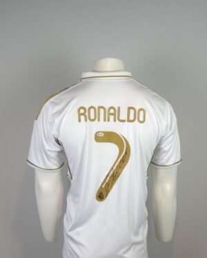 Dit is een gesigneerd thuisshirt van Real Madrid, uit het seizoen 11-12. Achterop het shirt de naam en het rugnummer van de voetbal grootheid Cristiano Ronaldo.