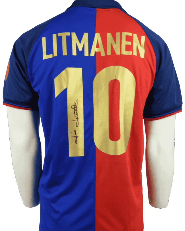 Barcelona thuisshirt 1999-2000 Gesigneerd door Jari Litmanen (Incl. tekenfoto) maat – L