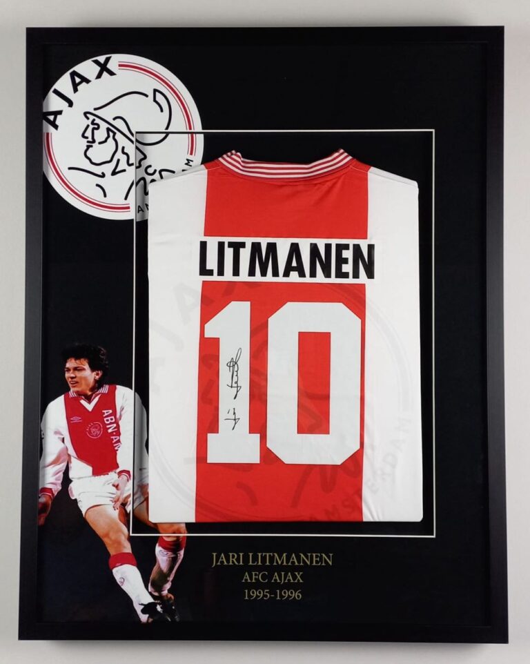 Ajax Ingelijst thuisshirt in speciaal frame 1995-1996 Gesigneerd door Jari Litmanen (Incl. tekenfoto)