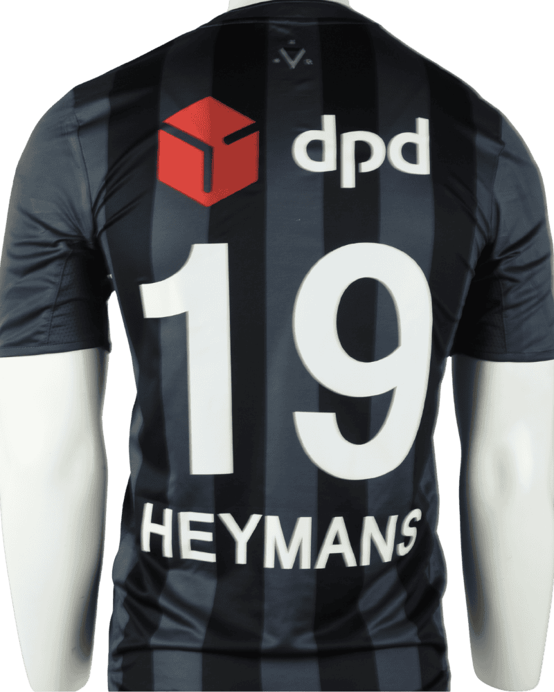 Achterop het shirt naam en rugnummer van verdediger Jonas Heymans.