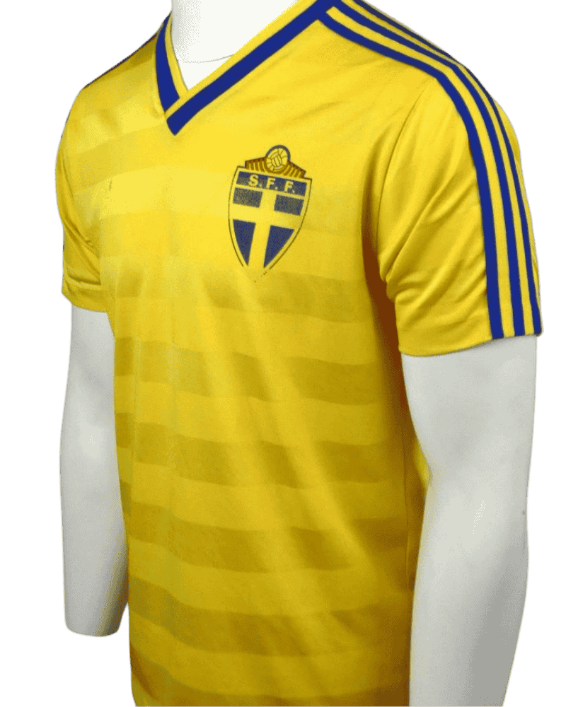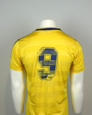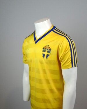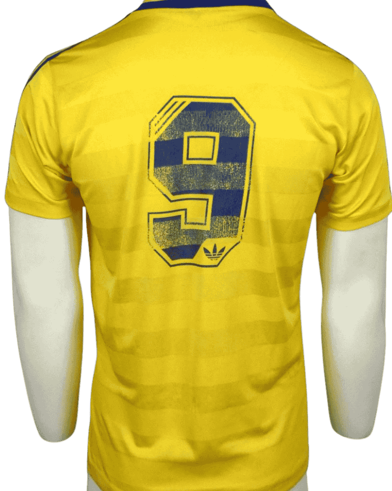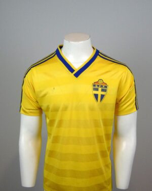 Dit is een uniek vintage thuisshirt van Zweden, uit de periode 1986-88. Achterop het shirt rugnummer 9. Bekende aanvallers waren o.a. Mats Magnusson, en Stefan Pettersson.